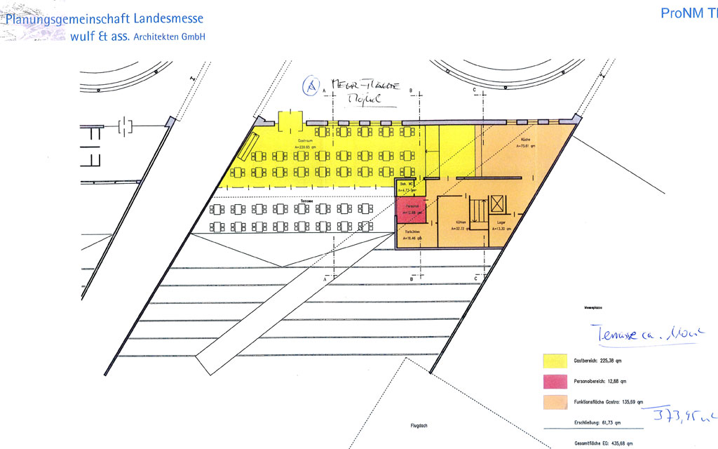 Auf unsere Anregung hin wurde mit der Projektgesellschaft Neue Messe im Auftrag eines Restaurantbetreibers die Machbarkeit eines Restaurants an der Neuen Messe-Stuttgart entworfen und untersucht.